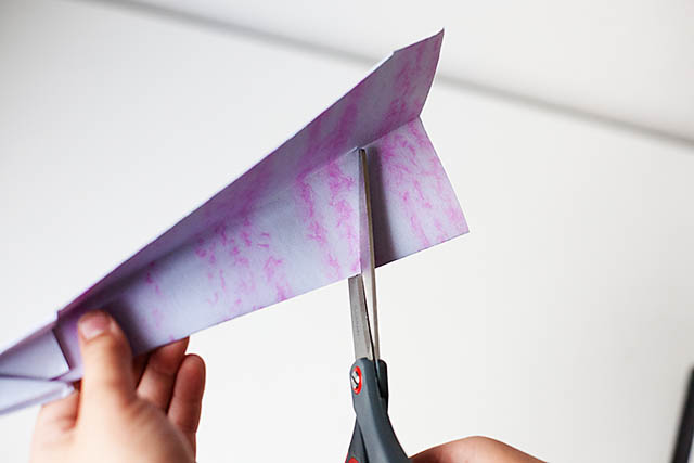 Holding your plane at the fold with the wings up cut a slit on the diagonal towards the back of your plane like this