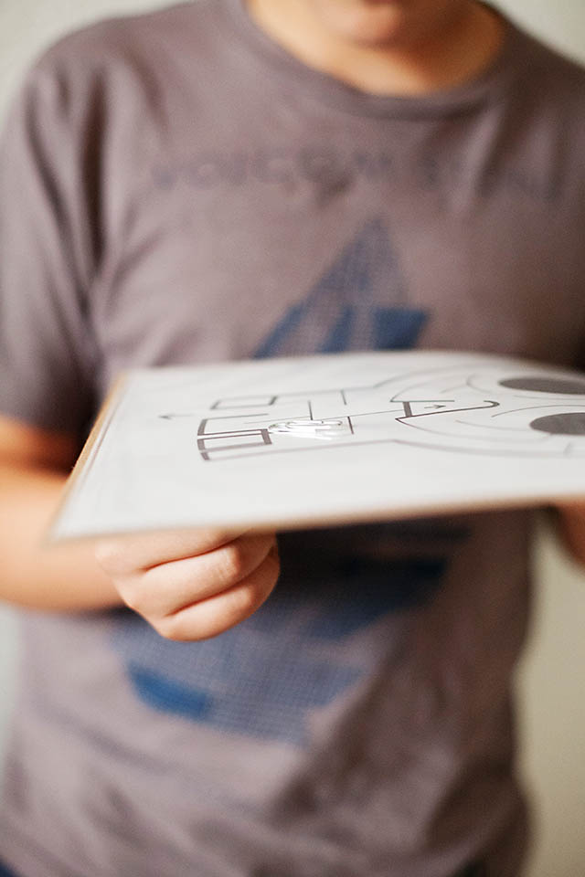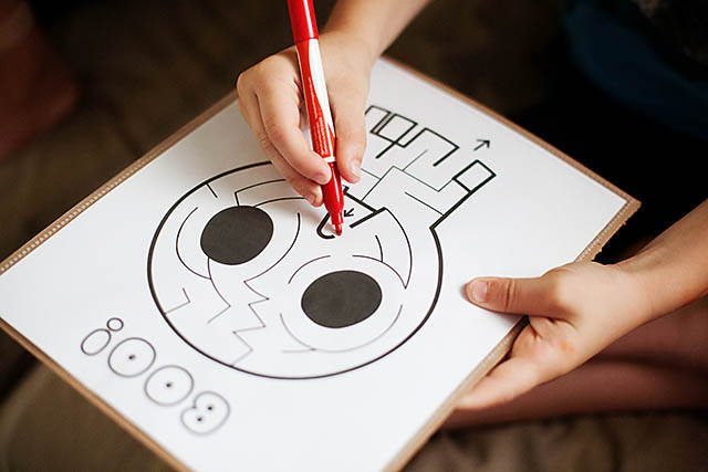 This idea is so simple but is a great way to play with printables over and over or while traveling. You’ll need a piece of cardboard and a page protector glued to one side. Your printables of choice (this maze is from Mr. Printables) a strong magnet and a paper clip (always watch kids around small objects like magnets as they are very dangerous if swallowed).