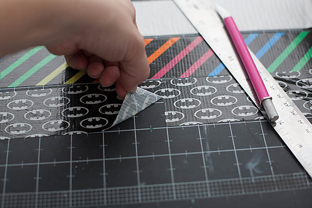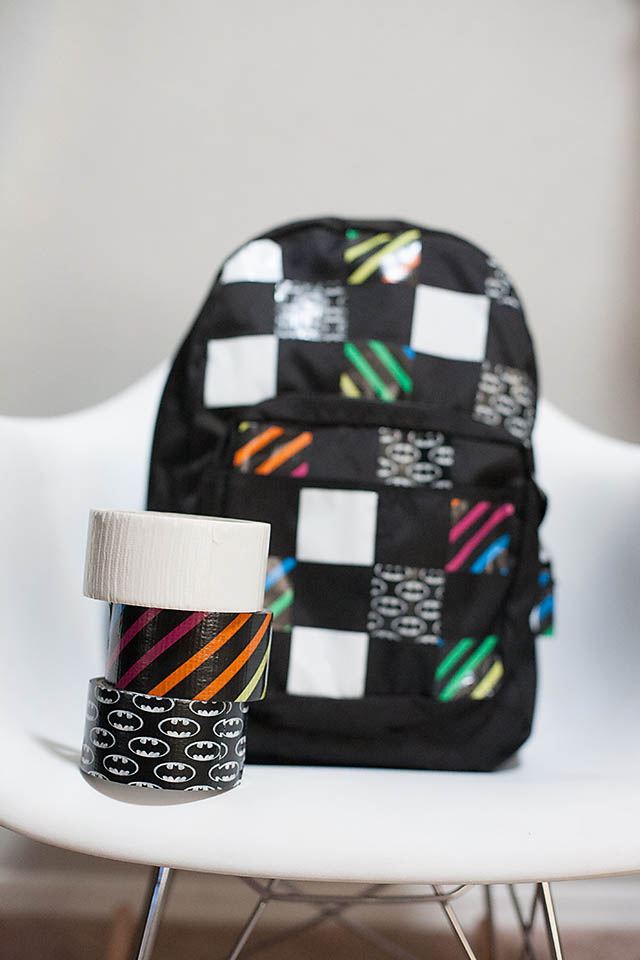 1. Choose 3 to 4 colors and patterns of Scotch Color & Pattern Duct Tape. For the first backpack we used Pretty Snakey, Jet Black and Pearl White. For the second backpack with squares we used Batman (Glow-in-the-Dark), Neon Stripes and Pearl White.