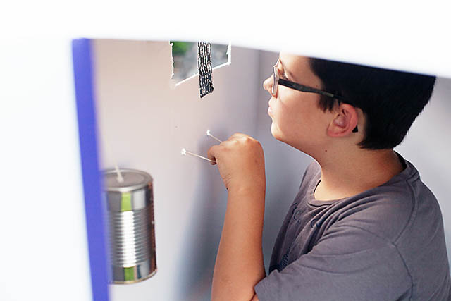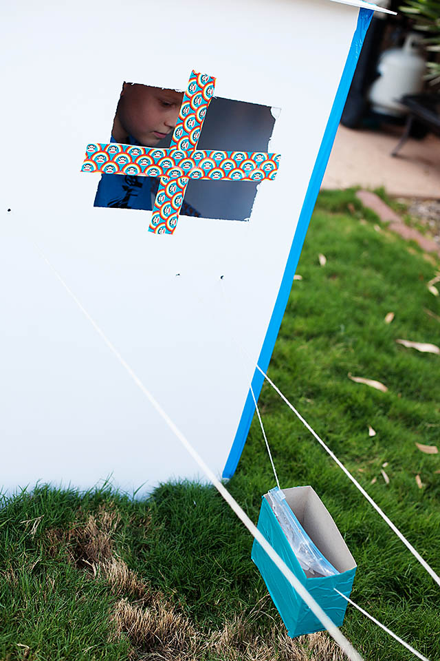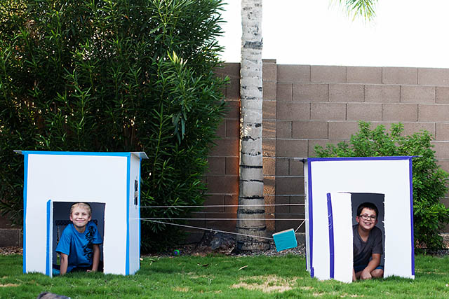 We put together these 2 forts in 20 minutes including a tin can telephone (old school!), a pulley system for snack passing and a doggy door for our mascot. The reason I LOVE duct tape for this project is because you can simply cut the seams apart at the duct tape to break down for easy storage. You’ll just have to tape it back together when you want to play again.