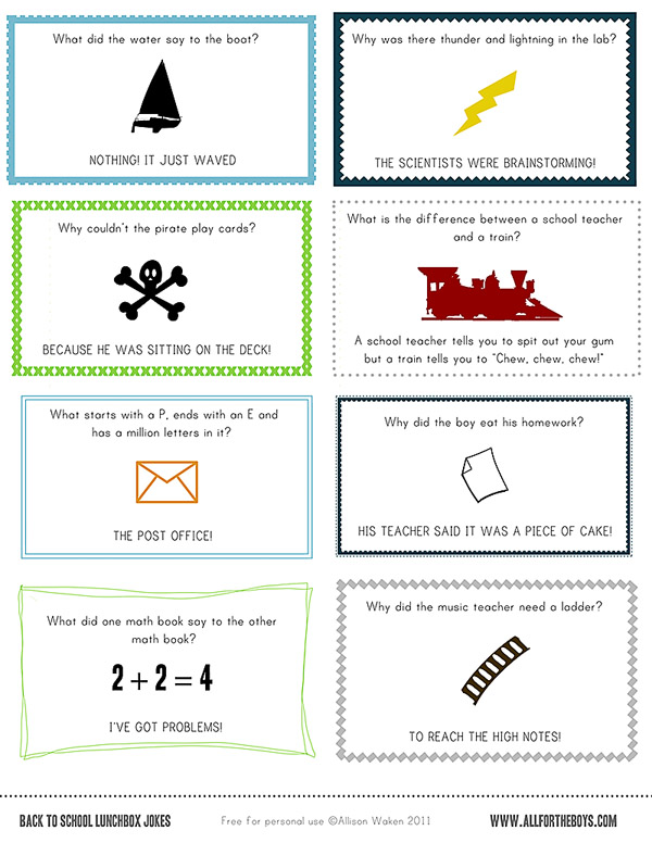 As promised on Facebook here is a fun free download for you! Printable lunchbox notes/jokes! There is a version with the jokes and a blank version to write your own love notes (I got in trouble for drawing an eyeball a heart and the letter “u” once so write at your own risk).