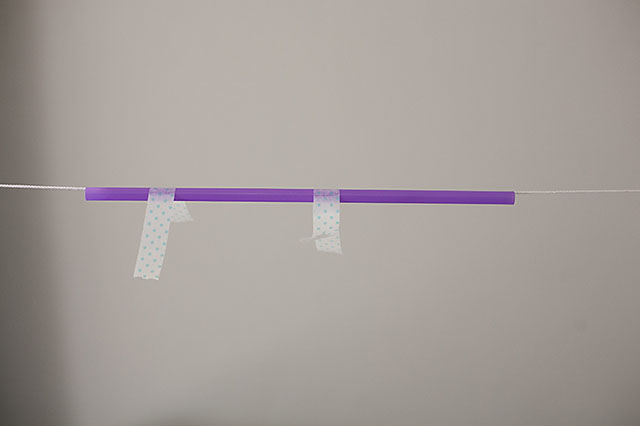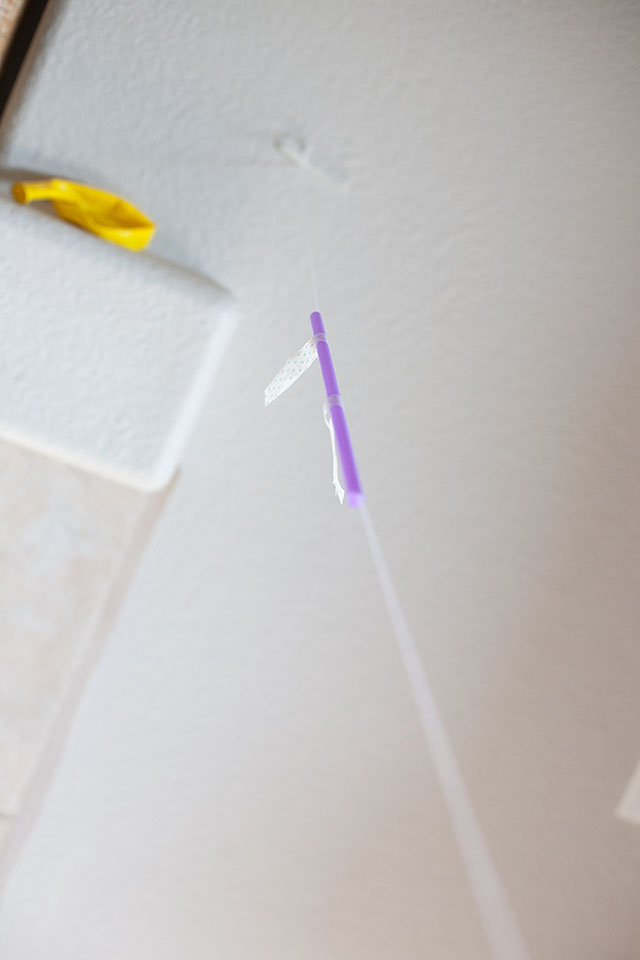 Add the straw to the string before attaching the other side to the wall. Place the tape on the top of the straw. We used washi tape so the balloon could come off and on easily. (Washi tape is basically thin, decorative masking tape so that or painters tape would work too)