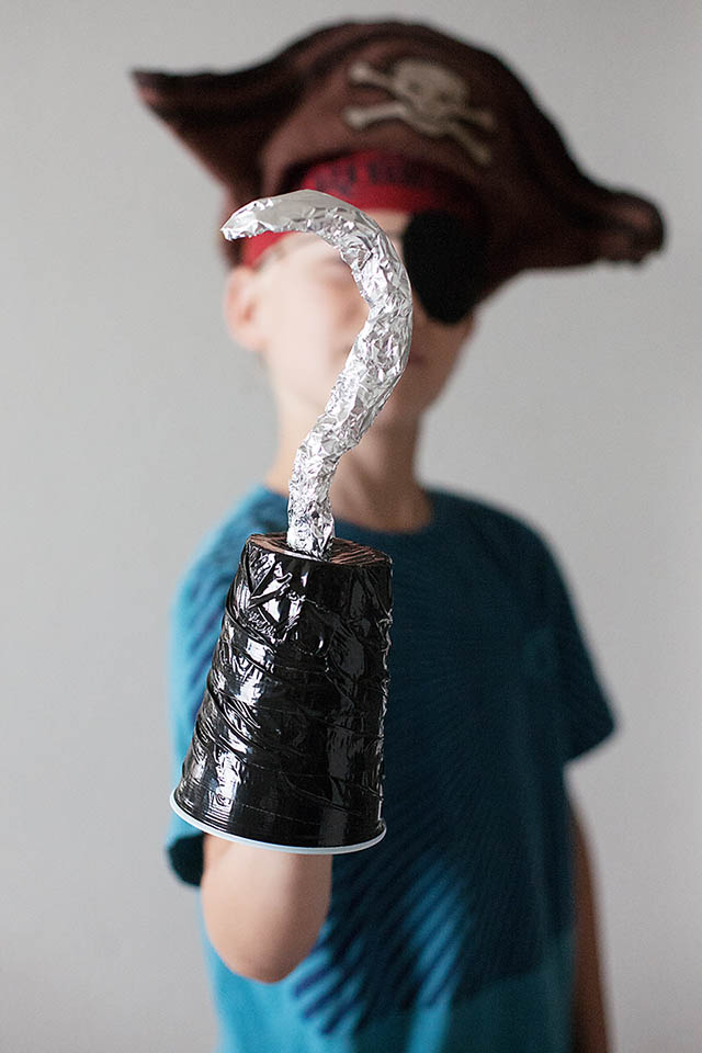 You may have seen this DIY hook before – it’s super easy. Just cut a hole or slit in a plastic cup, form a hook from some tin foil and slip in the hole. I was informed that pirates did NOT have blue hook bases so we covered our cup with black duct tape.