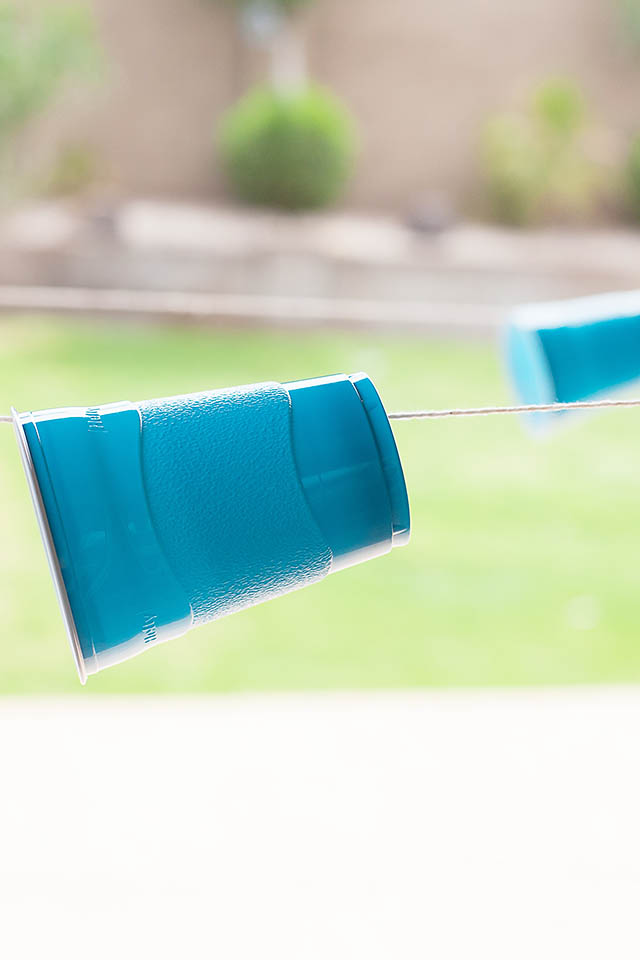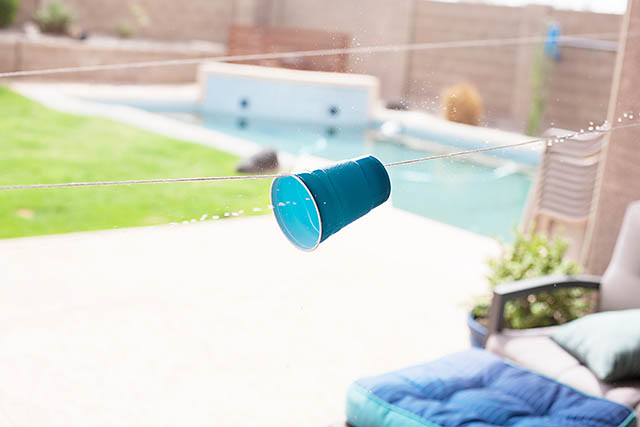 Cut or punch a hole into the bottom of the cup (I made mine close to the edge as opposed to right in the middle since the cup is resting on the string). Put the cup on the string through the hole and attach the string to posts or tape to a wall outside.