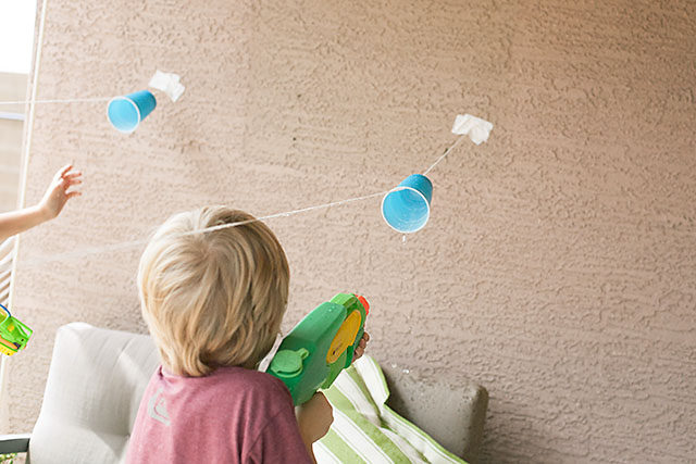 Use your water guns or other water squirting toy to get the cup to move to the other end. Unless your gun is super powerful you’ll need to pay attention to the direction of the water (good target practice)