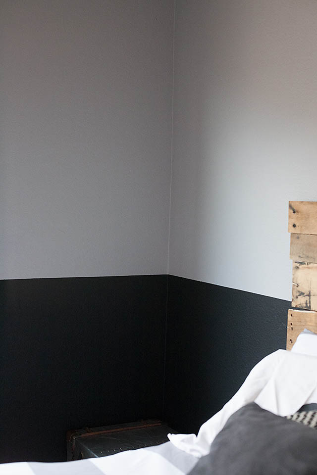 For his room I painted the Pebble Gray first (2 coats) and allowed to dry for a day or so. Using a laser level I marked my line on the wall and used painters tape to create a straight line. The black went on last and once the painters tape was removed a fun 2 tone wall effect was created.