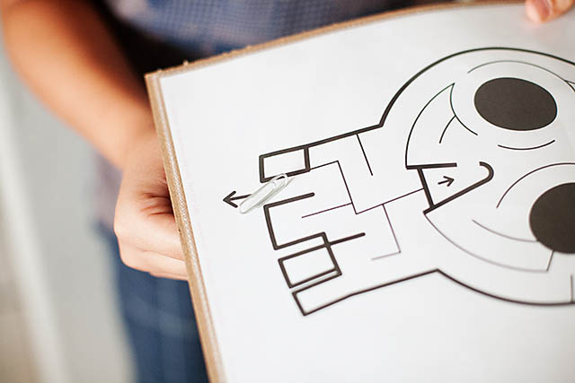 This idea is so simple but is a great way to play with printables over and over or while traveling. You’ll need a piece of cardboard and a page protector glued to one side. Your printables of choice (this maze is from Mr. Printables) a strong magnet and a paper clip (always watch kids around small objects like magnets as they are very dangerous if swallowed).