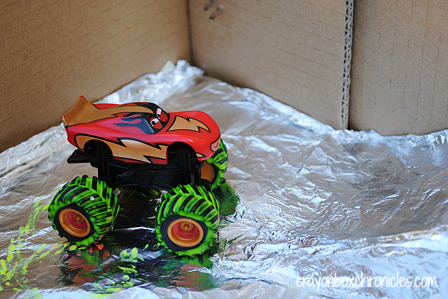 Add foil and you’re ready to go! No need for perfection, it’s going to be covered in paint! The tire-crushing power of monster trucks will smooth any bumps!