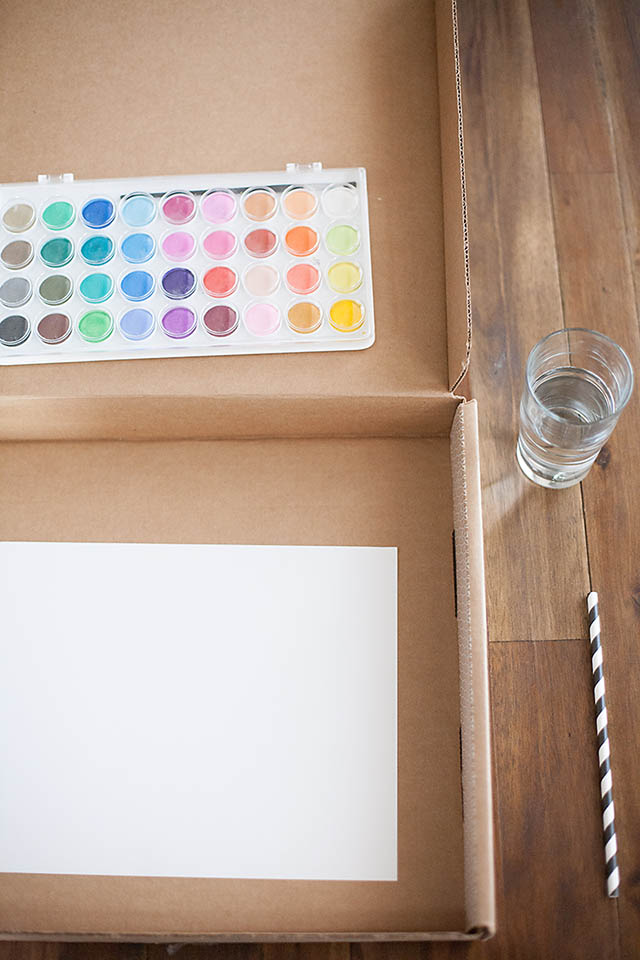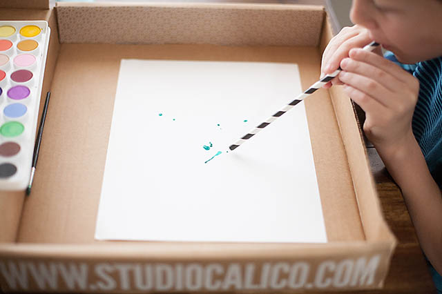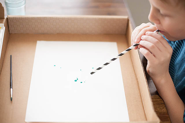 You’ll need water colors, a paint brush, water, paper and a straw. I like to do this project in a box to contain some of the mess. The longer they paint the messier (and more fun) this project gets.
