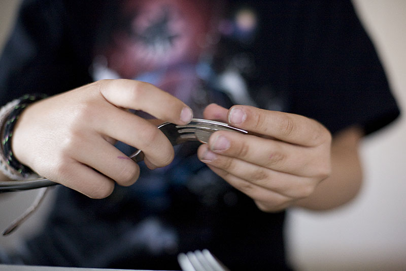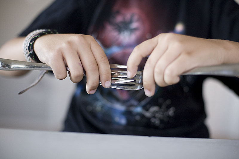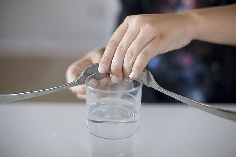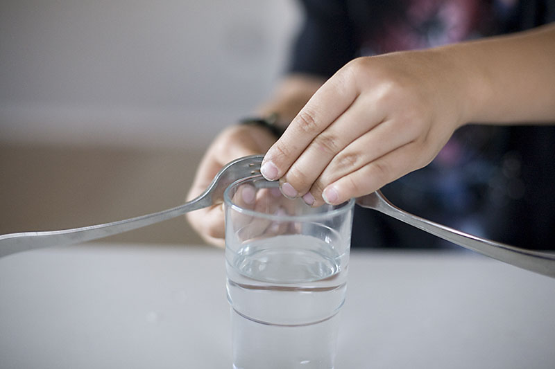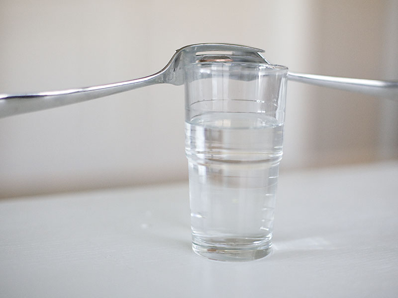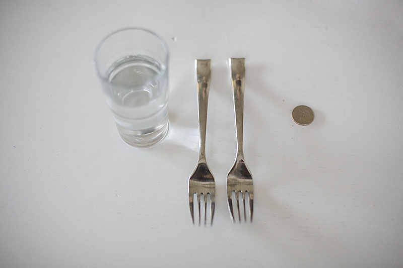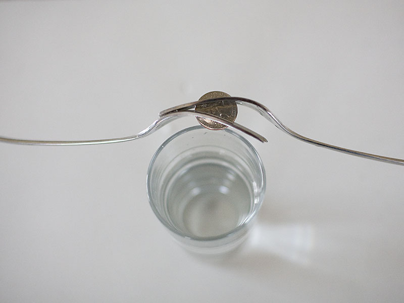 Then you balance the forks on the quarter which is on the edge of the cup. You adjust the positioning of your forks until they balance. Our forks are pretty curvy so they needed some adjusting.