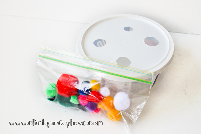 Amber over at Click Pray Love, recently had a Busy Bag swap with other Moms of 2-3 year olds. Each mom made enough of one type of bag for all kids attending so each kid went home with 10 or so different bags! They had lots of fun activities!