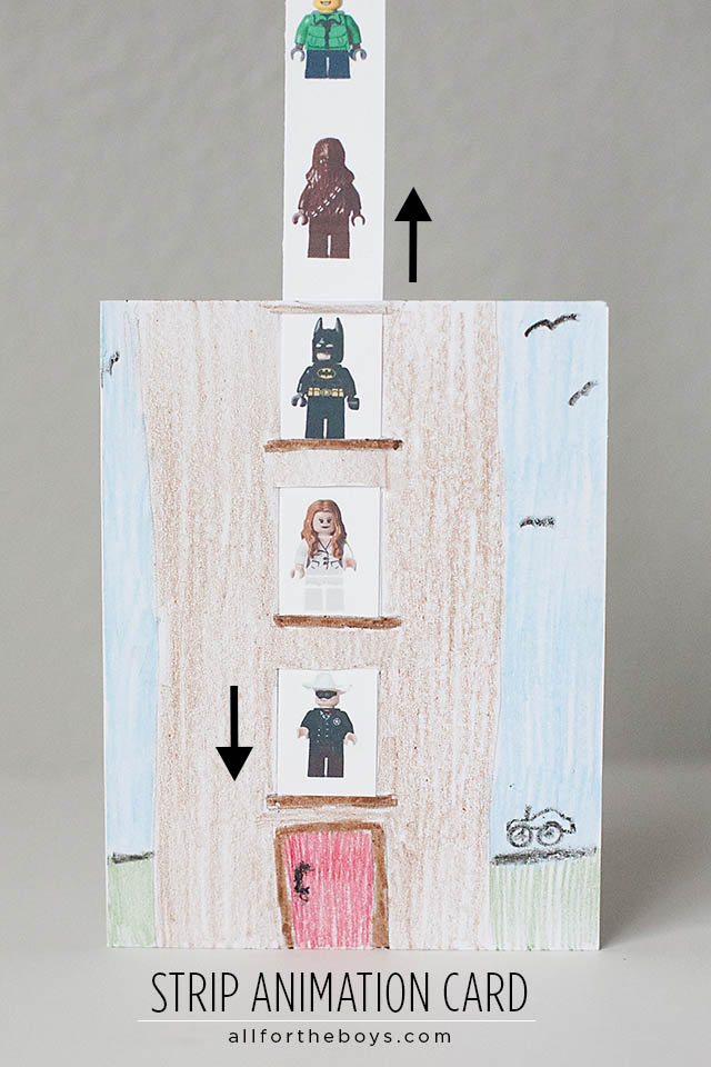 I don’t know about you but we always have extra boxes laying around here. I try to encourage the boys to use them before we recycle them because cardboard is such a great material. Sometimes they’ll stay around for a long time storing toys, drawing supplies etc. Today we wanted to use a small box with LEGO minifigs but it needed to have a “cool factor” so we decided on a store with a revolving door.
