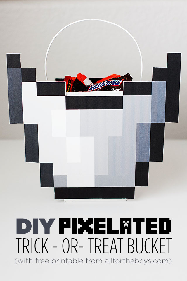 I mentioned on Facebook earlier that my boys changed their costume minds again and both are going to be Minecraft characters (a creeper and Steve). I’m taking the lazy way out and bought their heads at Target but throught they’d like a realistic Minecraft pixelated bucket to trick or treat with!
