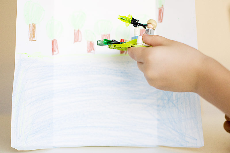 To go along with my secret stash we have some fun things that the boys like to do while waiting at a dinner table or airplane or wherever they need to sit still for a long period of time. One of those is making backgrounds for their Legos, plastic animals, Playmobils or whatever small toy they happen to have along at the time.