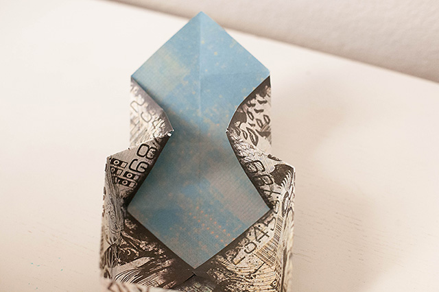 Next you’re going to take the pointed ends and fold them in so it folds over itself making another wall