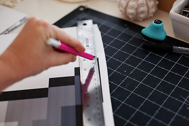 Print out the 2 page printable and cut the bottom and top border off so the edges of the printing can meet. Glue to cardboard or foamboard (for stability). Make sure to apply glue to all the edges or they’ll lift off.