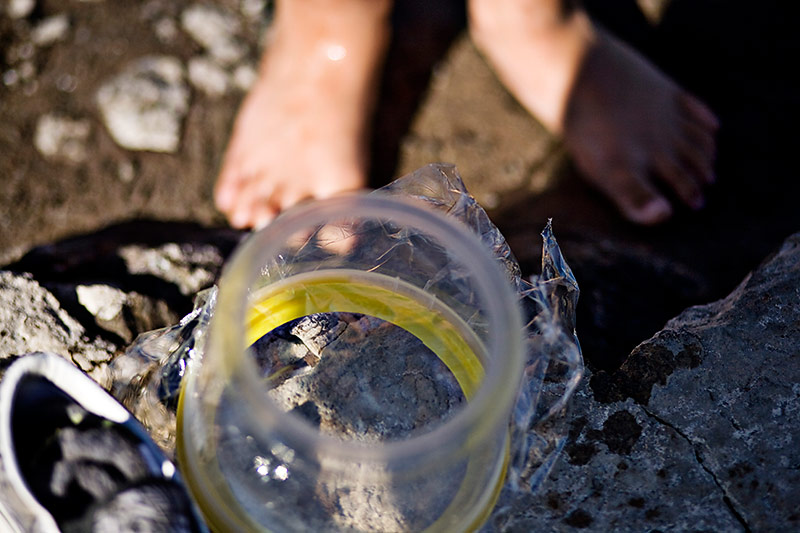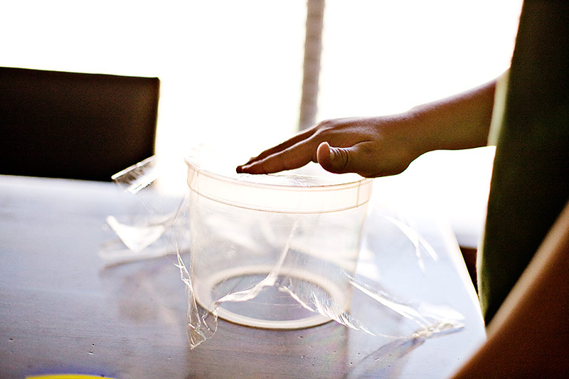 Then, making sure you leave some slack (this helps magnify what you see a bit when the pressure of the water pushes it in) you put the lid back on and it holds the plastic wrap in place! If you have a container without a lid you can secure the plastic wrap with a rubberband.