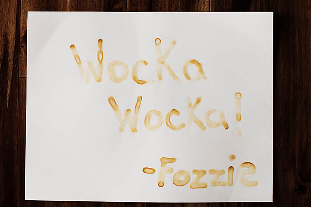 Write on a piece of paper with milk and a paintbrush or qtip (make sure your paintbrush doesn’t have old paint in it) the thicker the milk the better.