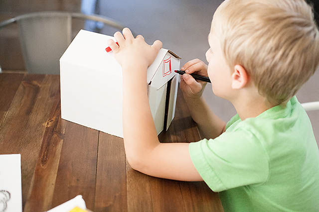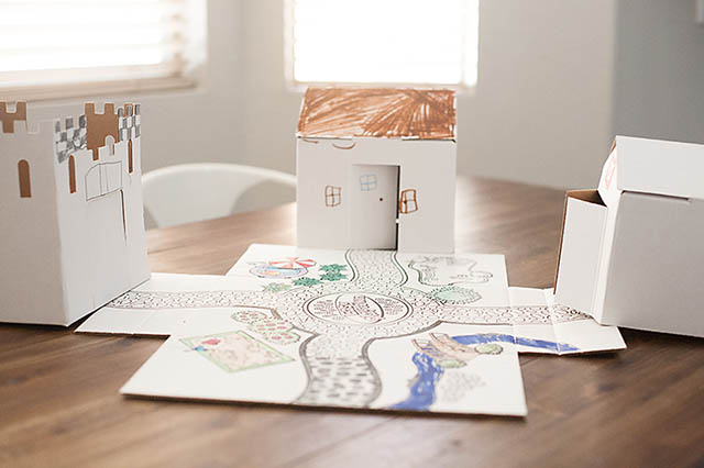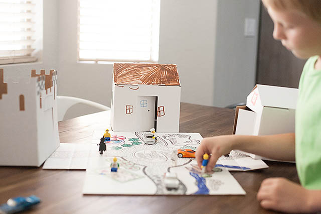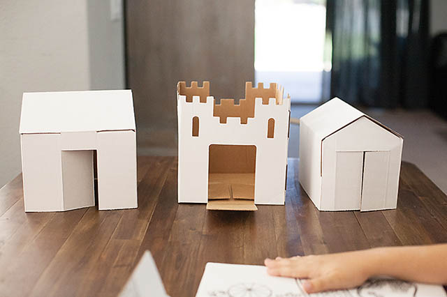 Cardboard is a favorite material of ours. It’s easy to decorate, sturdy, and even better when it can be broken down! We were recently sent an Easy Playtown Set from Square One Kids to try out for you all. It’s a play set made from cardboard. The whole set comes in it’s own box which turns into the “mat” and has 3 buildings.