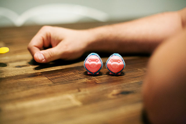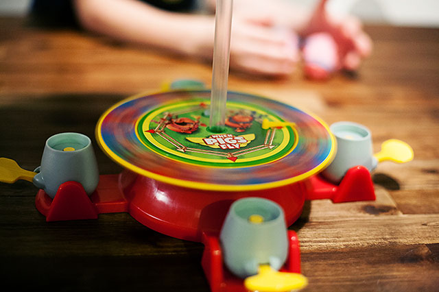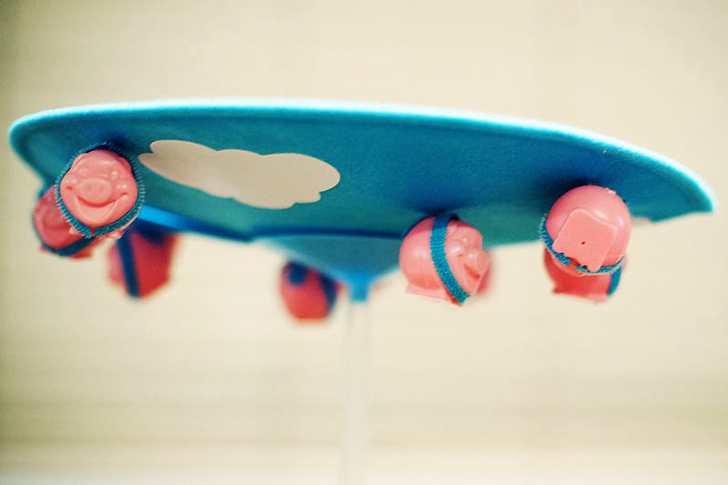 You get little plastic pigs with velcro wrapped around them and a spinner with a rotating sky above. You spin the spinner to see whether you can launch your pig, take a pig from the sky, or give a pig to someone else. The goal is to have no pigs.