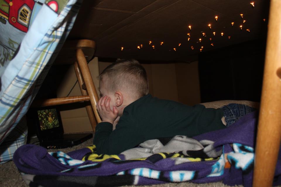 Stacy shared this awesome “starry” fort on our Facebook page. They popped white lights into little holes in the cardboard. A perfect place to watch a movie.