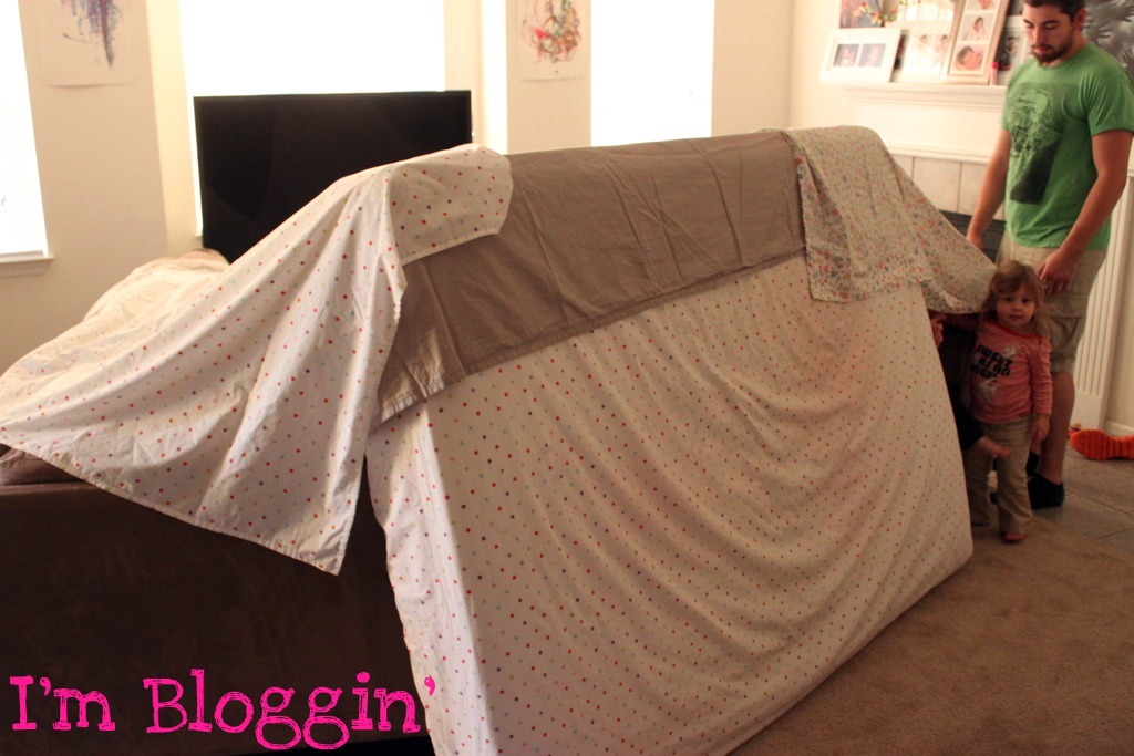 A favorite of my boys is using a broom in between couch cushions to lift up a fort – we used a fitted sheet so the corners could grab on to the edges of the sofa