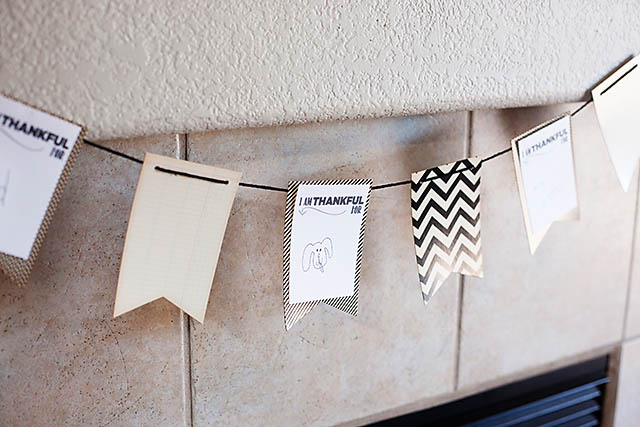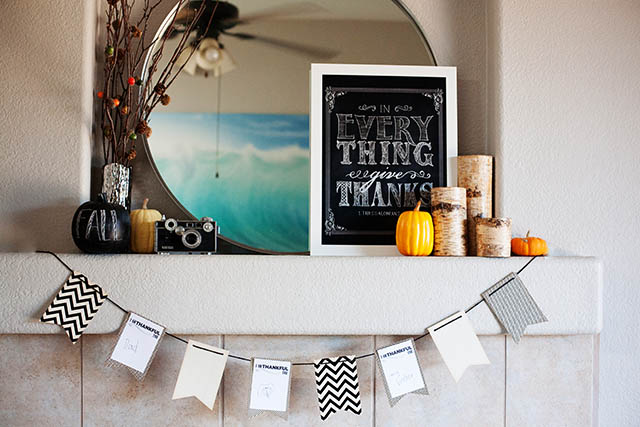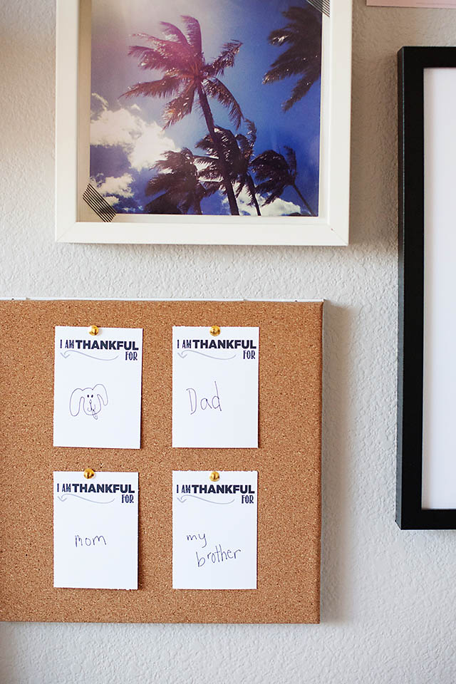 Print the cards (I used white cardstock) and trim just inside the black line. Leave out a stack and have family members write or draw what they are thankful for each day. Display the cards or just collect them in a jar on the counter.