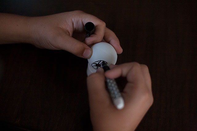 Start by cutting an “x” on the bottom of the ping pong and sticking the fake flame of the tealight through the x. This will let your child know right where to draw the eye.