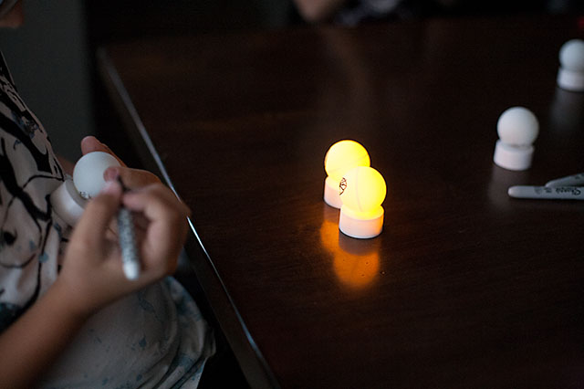 You’ll need ping pong (table tennis) balls, LED tealights (the cheapest I found them was at Walmart 6 for $2.50 regular price or you could get a 12 pack at Michaels or Joan with your weekly coupon), a small knife for the parents, and whatever materials you’d like to decorate them with.