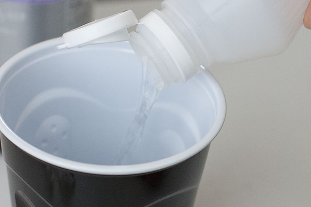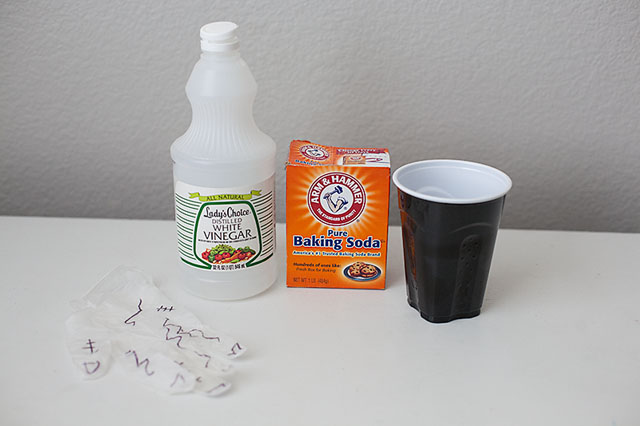 You’ll need baking soda, vinegar, a latex or vinyl glove, and a cup.