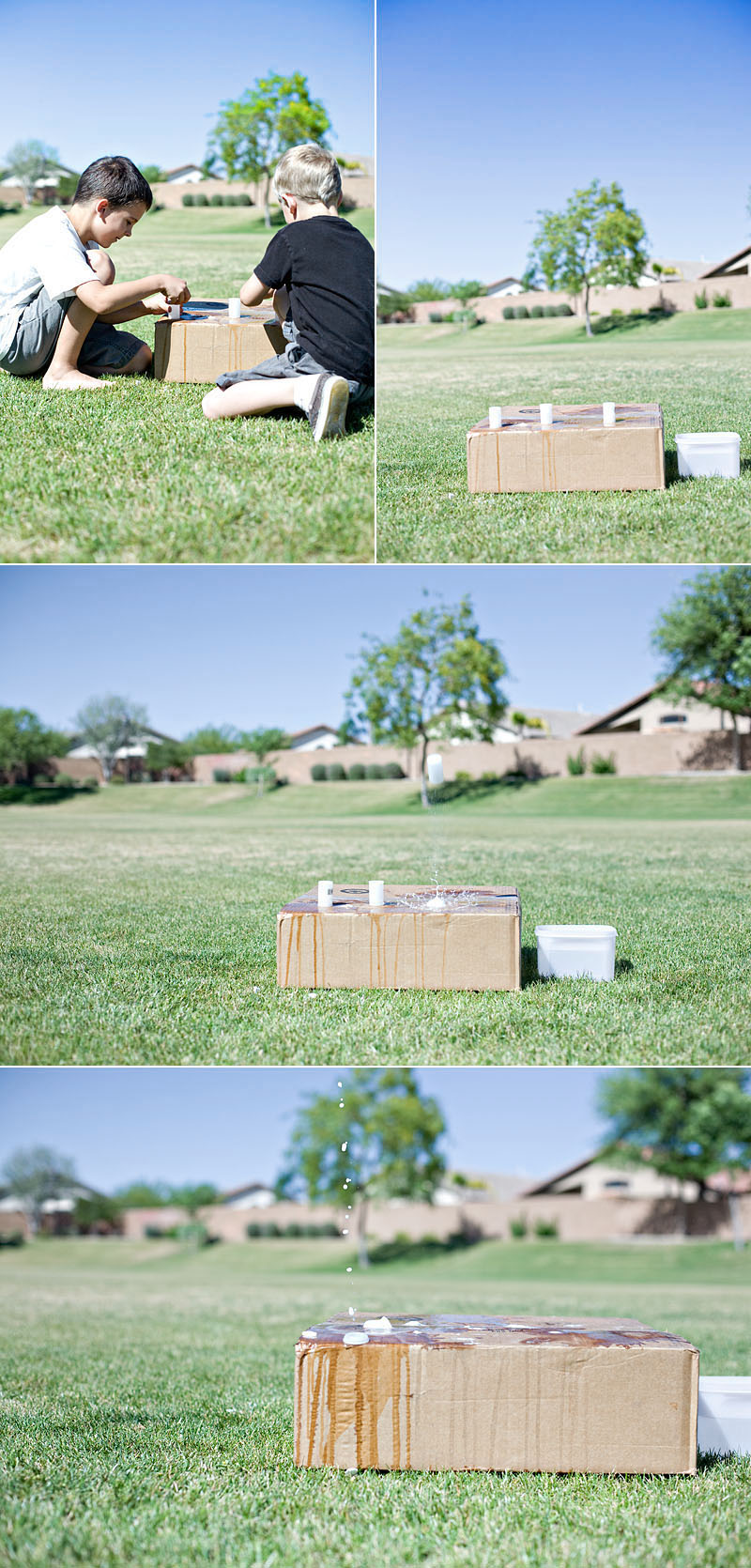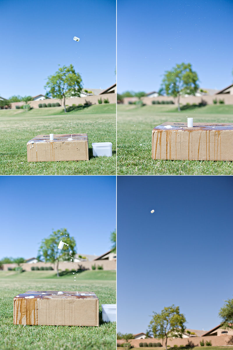 Quickly drop in a piece of the tablet, put the lid on all the way, place upside down, and RUN! (the goggles are to protect little eyes from flying rockets and flying Alka Seltzer. There is something so fun about seeing how long it will take the rockets to blast off, or how high they’ll go. Sometimes you get a dud and the boys think it’s pretty funny.