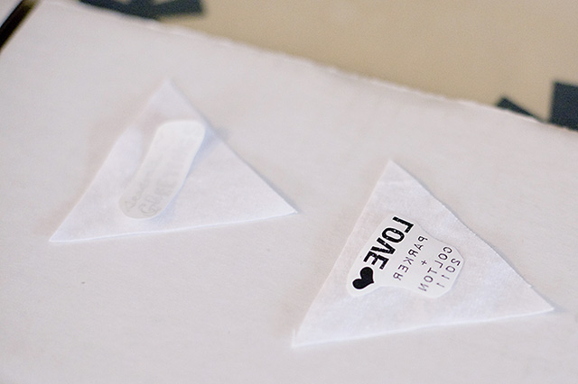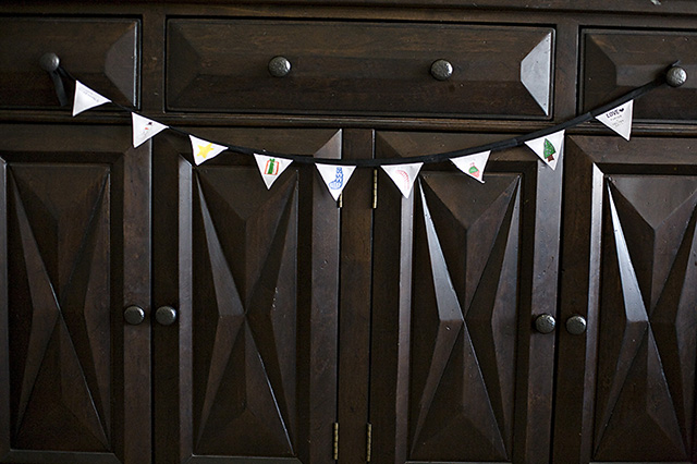 I cut my fabric into little triangles to form a garland. Then I ironed the transfers on using a sheet of cardboard underneath and a kitchen towel on top to protect my iron just in case!