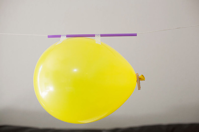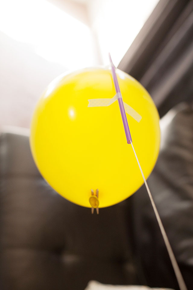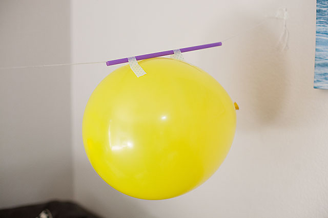 I think balloons are one of those things you should always keep on hand just in case. This is a fun quick project that can be as time consuming as you make it! Basically you tape a balloon to a straw on a string and watch it fly! It’s best to attach the string to a door nob but tape will work too – just be prepared to keep re-taping.