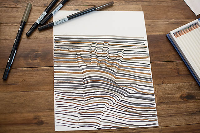 Next you grab the markers of your choice (we used the Grunge dual brush pen set) and start a pattern with straight lines (we didn’t stick to the pattern 100%). Once you get to the outline of your hand instead of continuing with your straight line you’re going to arch up until the other side of your outline and then continue with your striaght line repeating for any fingers (easier to see in the photos than try to explain)