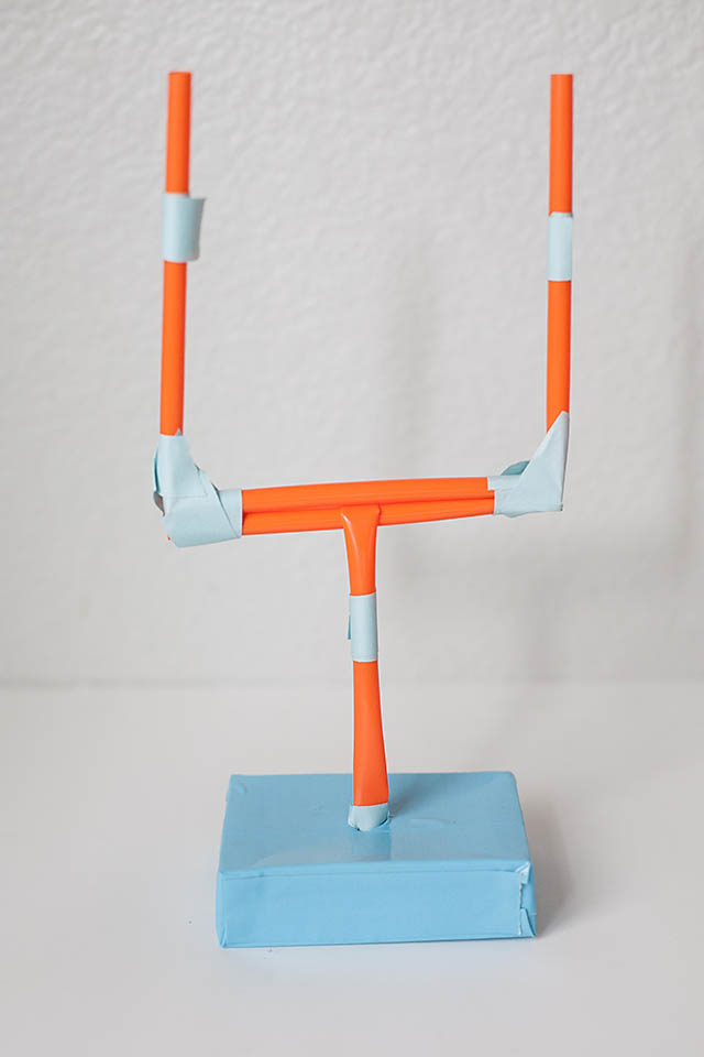 Fold your straws to create the “u” shape of the field goal posts and tape into position. We used colored washi tape for fun. You can use your team’s colors to make yours!