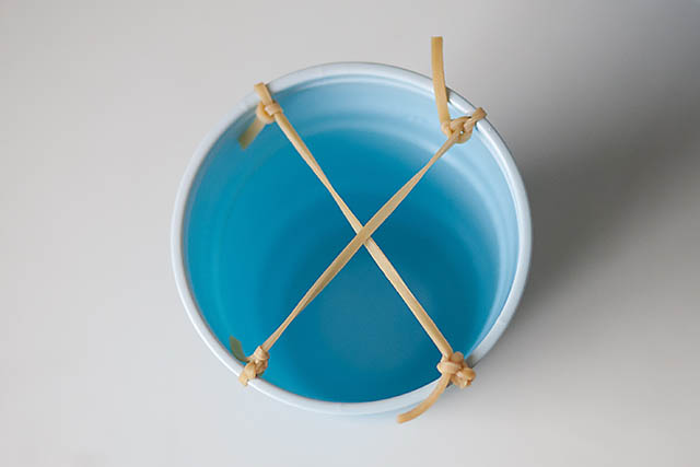 Tie 2 pieces of rubberband in an “x” across the cup through the holes.