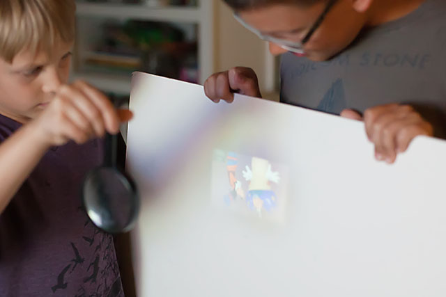Hold your magnifying glass near the white board between the board and the light source. Slowly move the magnifying glass away and towards the board until you get a clear picture. It’s upside down!