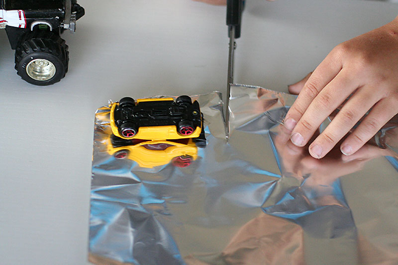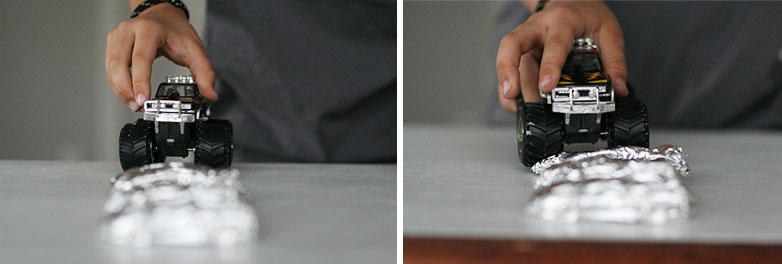 All you need are cars, monster trucks or RC car would be cool too, foil, and scissors. We prefer heavy duty foil because it holds up to more re-forms than the regular giving you more life out of your DIY cars.