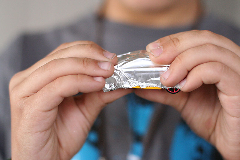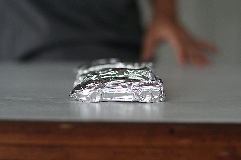 Wrap the car in the small piece of foil making sure to press it into the details if you want a more realistic look.