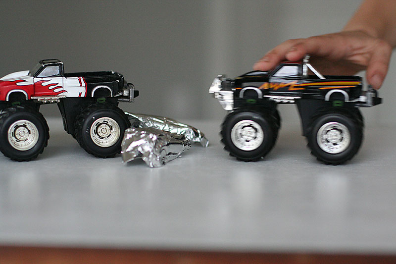 I swear my brother had some sort of similar toy when he was little but I couldn’t find it online. Don’t stop at cars, you could wrap foil around any toy to smash with the Monster Trucks. Make some ramps out of cardboard and you have yourself a whole track!