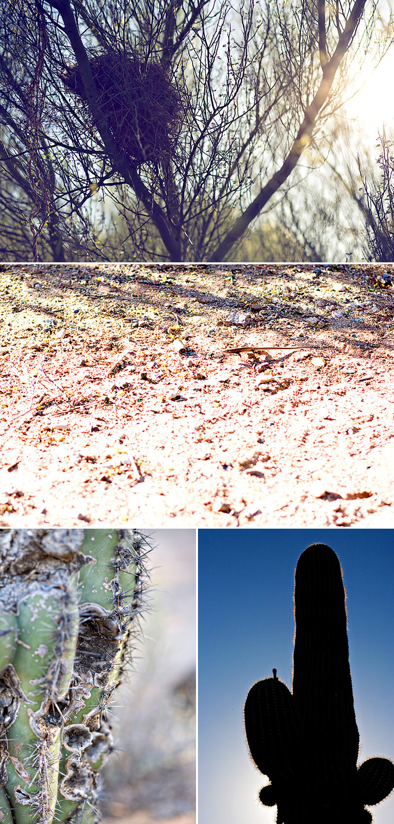 We see nests and lizards (can you see the lizard? Desert animals are very good at camouflage) That little thing poking out the top of the cactus arm in the last picture is a flower bud. My kids used to call them pickles 🙂