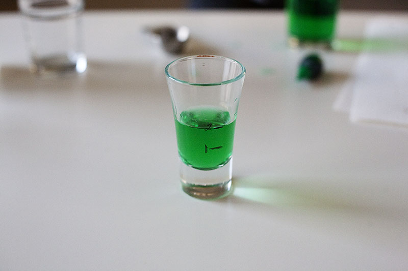 (doing this experiment can be fun with any amount of water and/or different colors of food coloring we only had green and I only had a tiny bit of alcohol left so this is what we did)