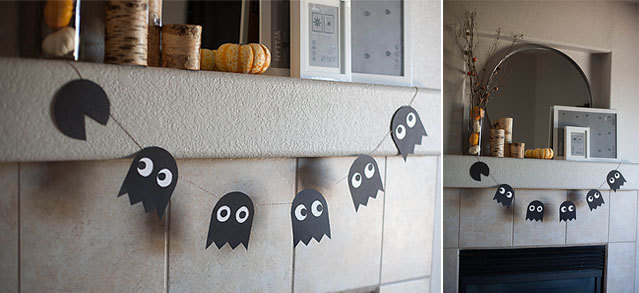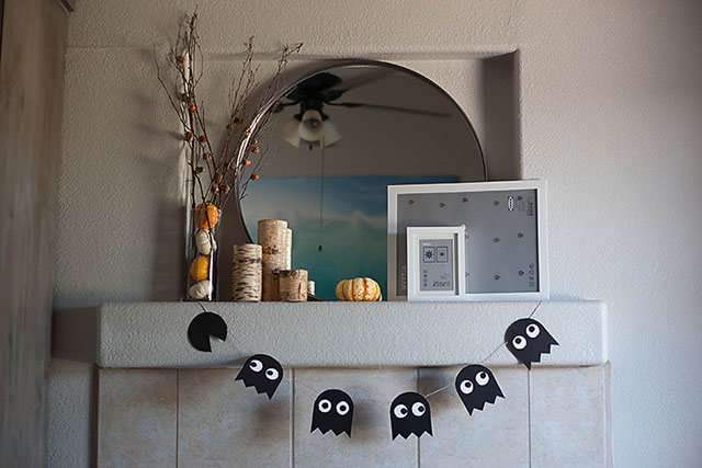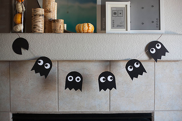 The boys are getting the holiday itch thanks to stores and neighbors getting their decorations up! They were excited to make our own Halloween garland using this template from Minieco. We didn’t use clear plastic behind the eyes just white paper.