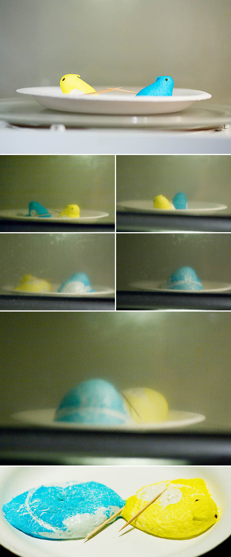 Peep jousting is pretty much what it sounds like – Peeps. Jousting. You stick a toothpick on them, put em on a paper plate, stick them in the micro and see which one “wins”!(the one that deflates the other) Peep jousting!