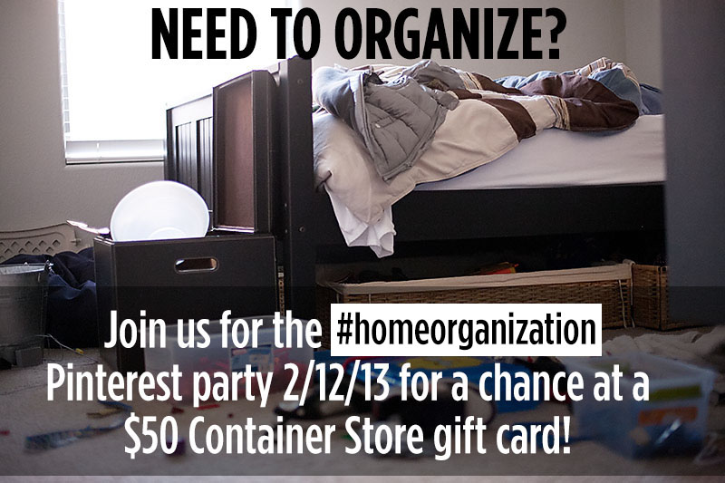 On Tuesday, February 12th from 8-9pm MST (7-8pm PST, 10-11pm EST), I’ll be pinning live on Pinterest with a few of my bloggy friends! We will be pinning organization ideas and inspiration with the tag #homeorganization. You have the chance to win a $50 gift card to the Container Store!