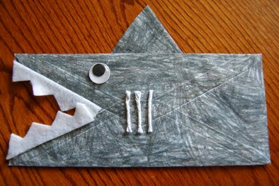 I heart crafty things came up with this awesome evelope shark and Frogs in My Pockets has some printables for him to munch.