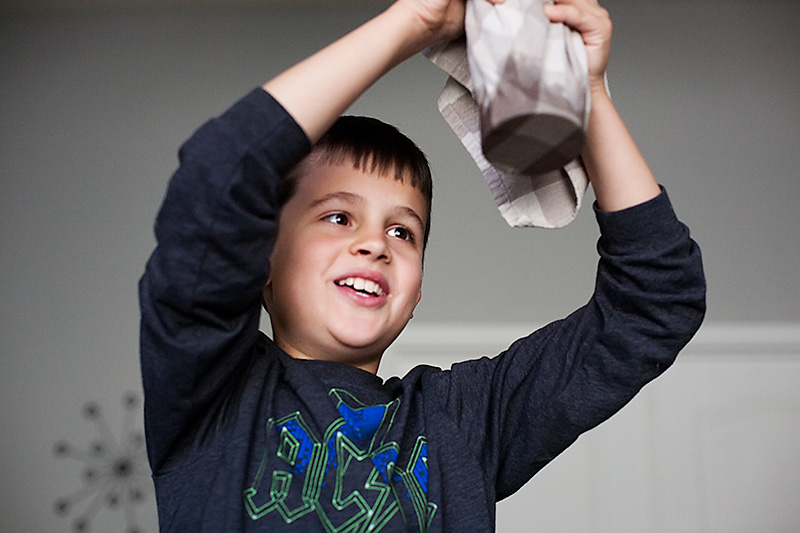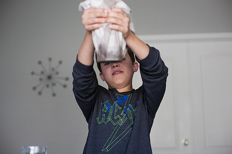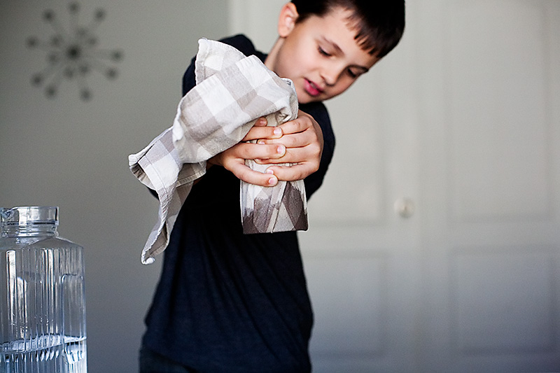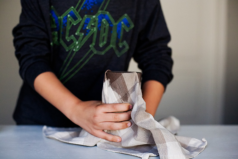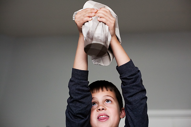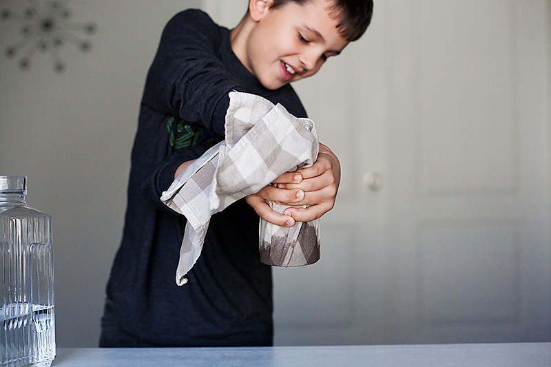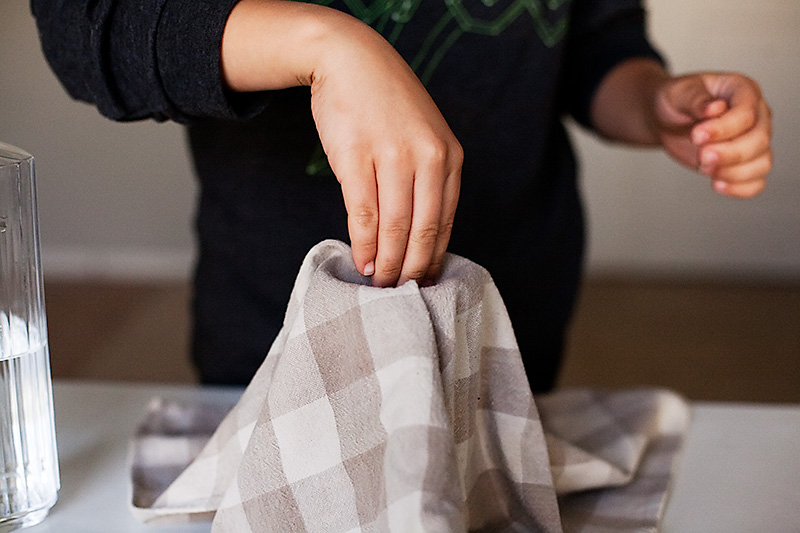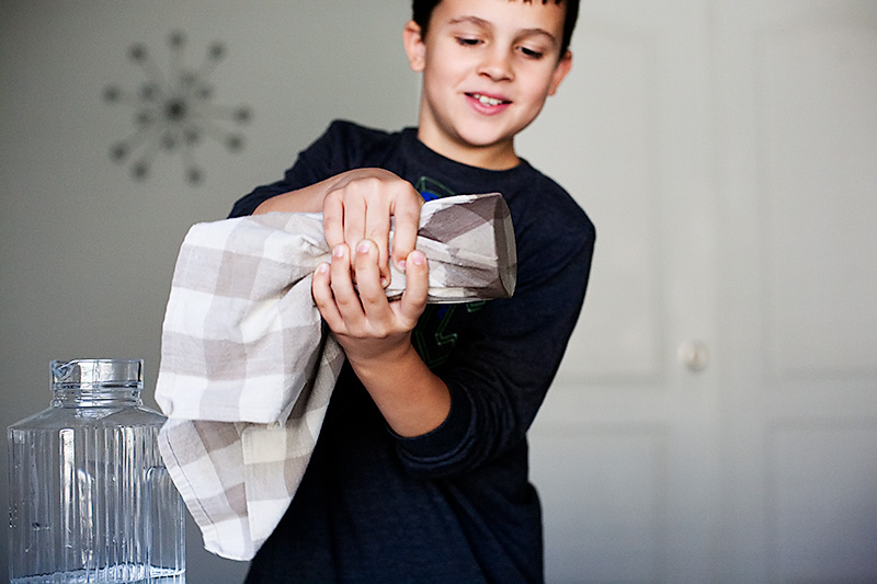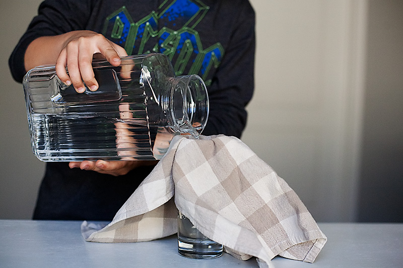 This is a fun little water “magic” trick. All you need is water, a glass, and a hankerchief or other thin cloth/towel. We used a tea towel becuase it’s what we found!