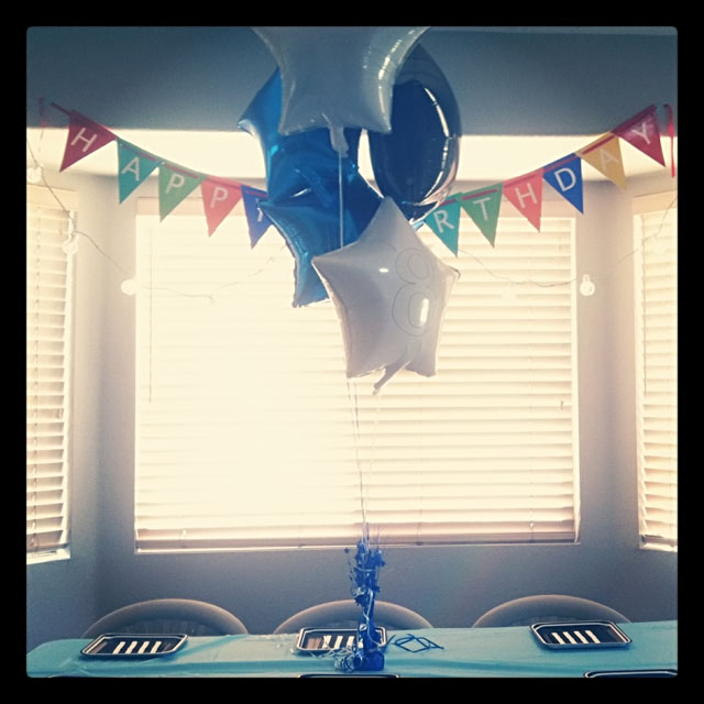 We had planned on moving beforehand and were supposed to be settled in by then. Things changed and we were in the new house but just barely. There was nothing there. So we brought a few things over so that we could sleep there since that was the address on the invite. Then we realized that no one had RSVP’d except for one boy. I didn’t want to plan a million activities for 6 kids when we may have none. So I bought decorations and got snacks last minute. We picked out some things to put together a few goodie bags.
