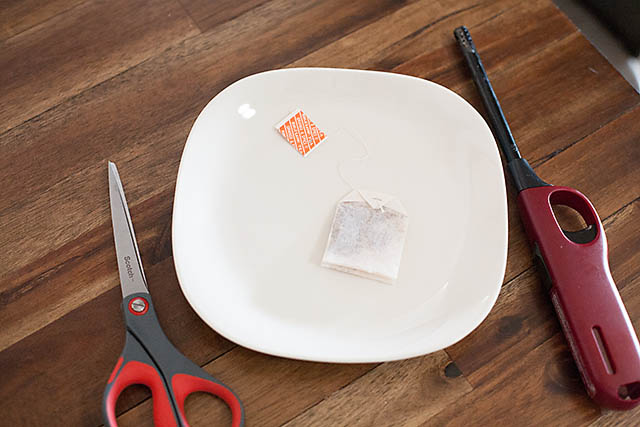 You’ll need an new tea bag (not used), scissors, a non-flammable plate or surface and a lighter of some sort.