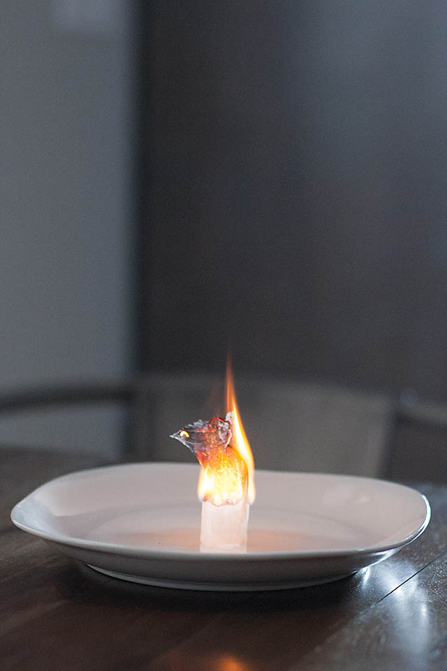 Stand it up on it’s end on the plate or other non-flammable surface.